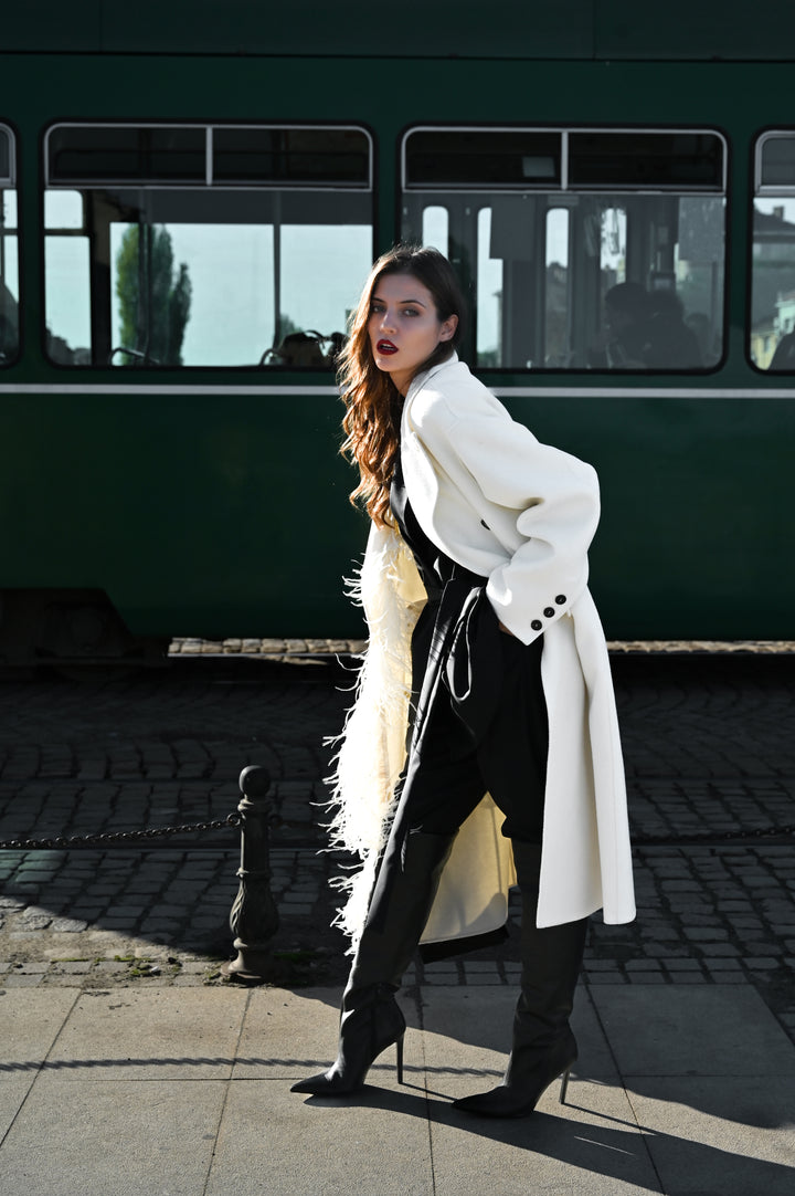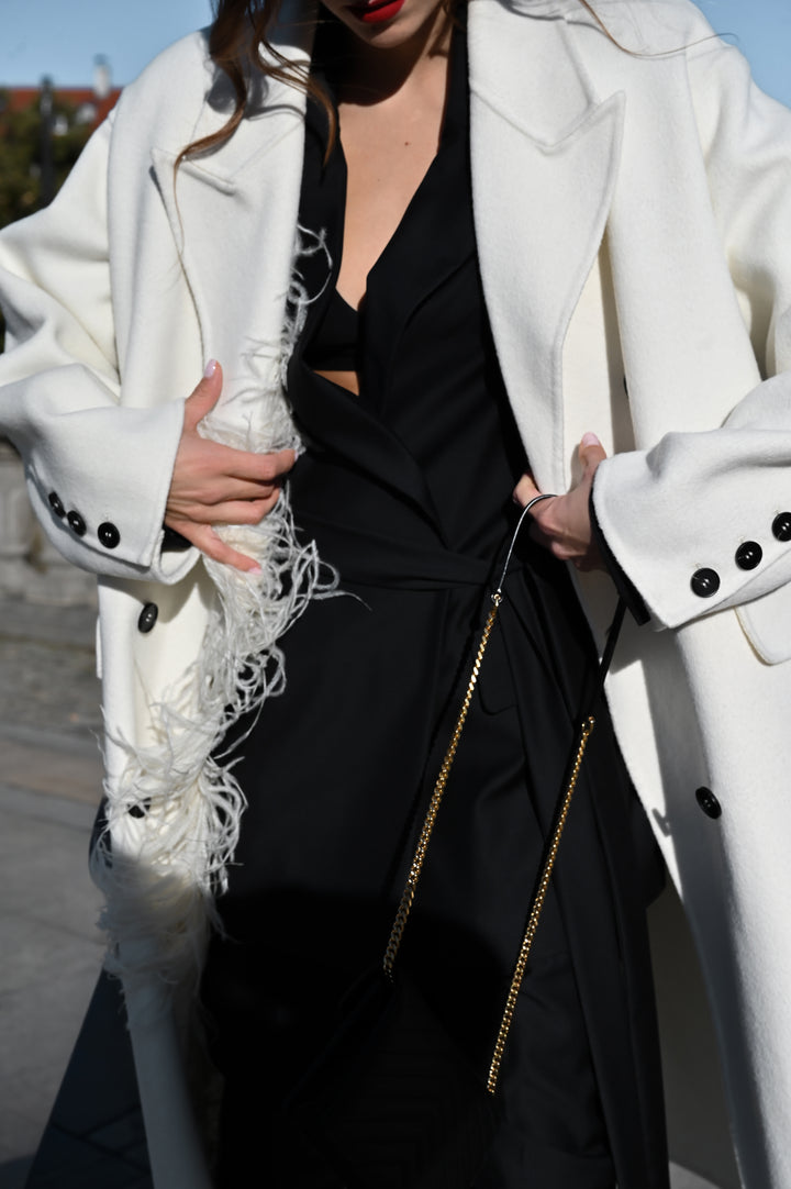 Палтото „Anne“ е съчетание на елегантност и модерен лукс. Изработено от 100% чиста вълна, то осигурява изключителна топлина и изтънчен силует. Щраусовите пера придават ефирност и движение, а благодарение на подвижния им дизайн, палтото може да се носи и като класически модел. Предлага се в нежно екрю и класическо черно – идеално за всеки повод, от деня до вечерта.