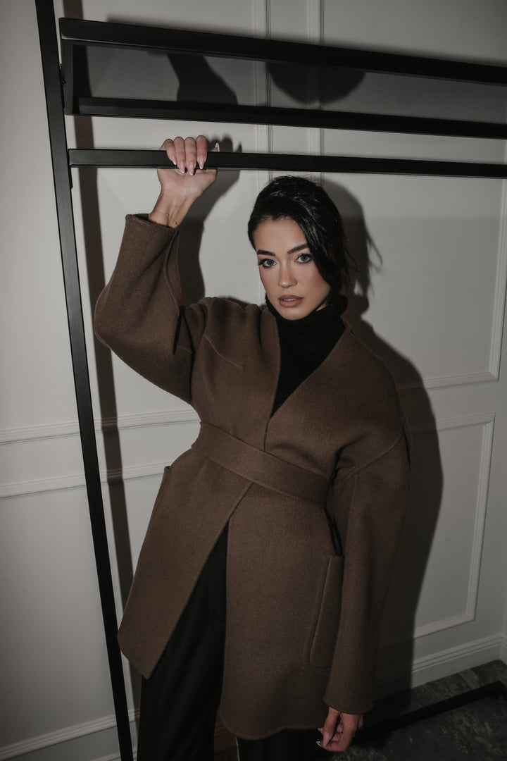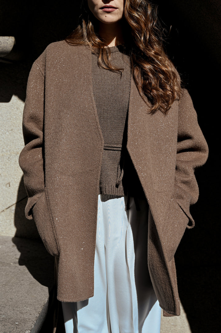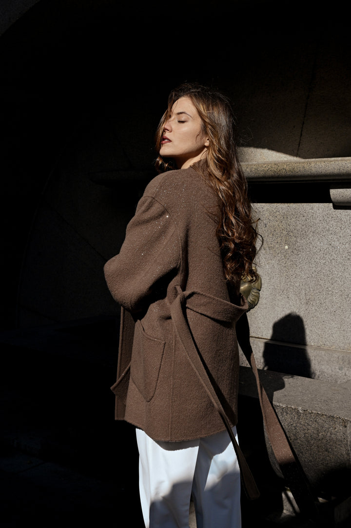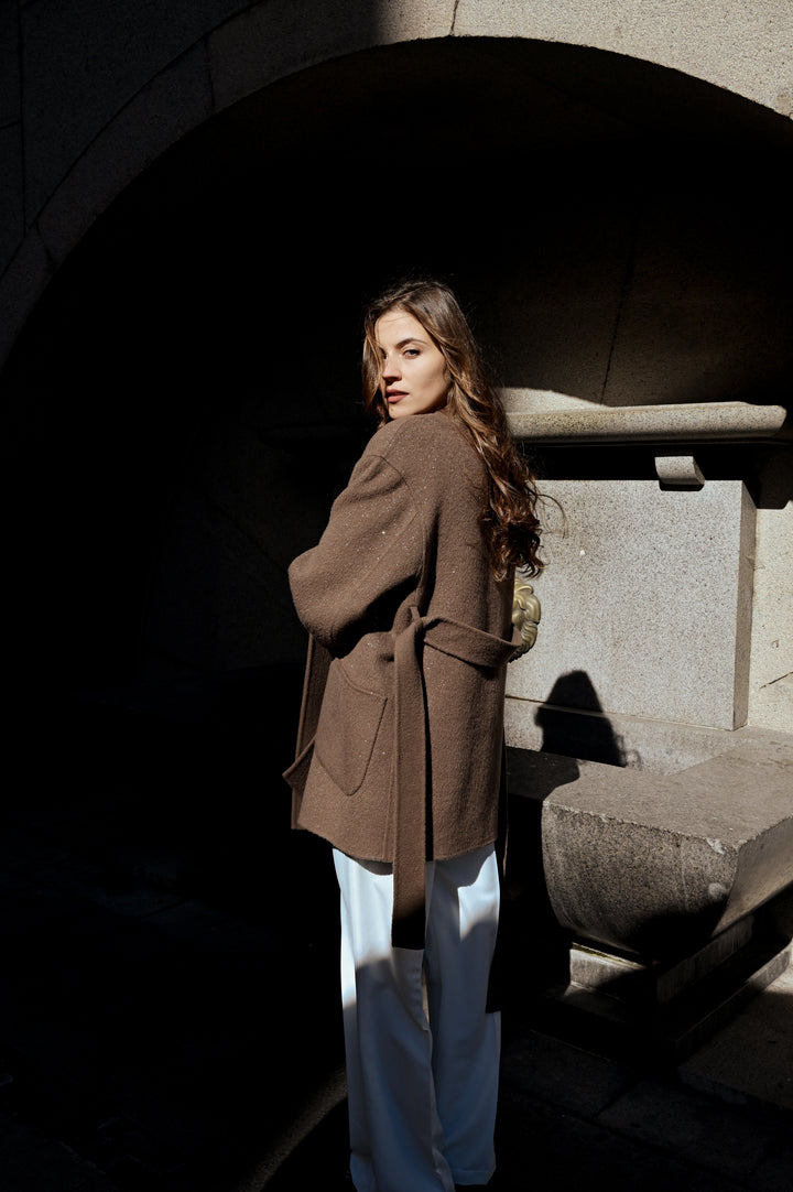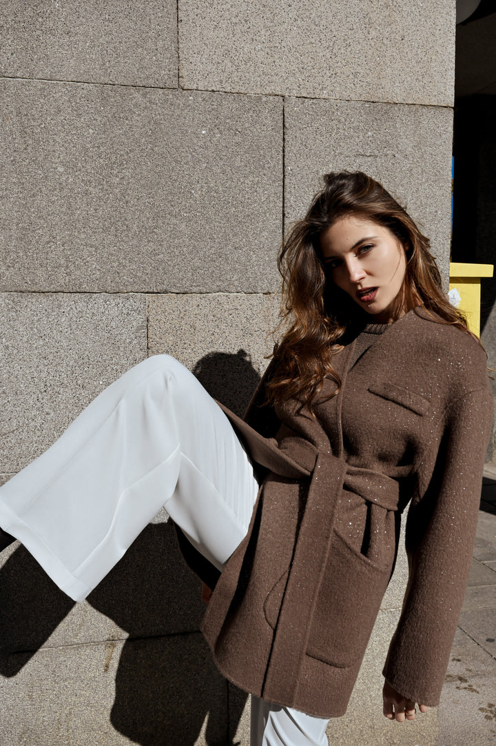 Палто "Beau" е изработено от уникална двустранна материя, предлагаща бляскав завършек от едната страна и елегантен, минималистичен вид от другата, което ви позволява лесно да сменяте стиловете на обличане. Кафяв мек нюанс. Силуетът наподобява класическо сако с колан, който подчертава талията. Носете с колана или без него за по-небрежна визия. Идеално както за официални поводи, така и за изисканото ежедневие.
