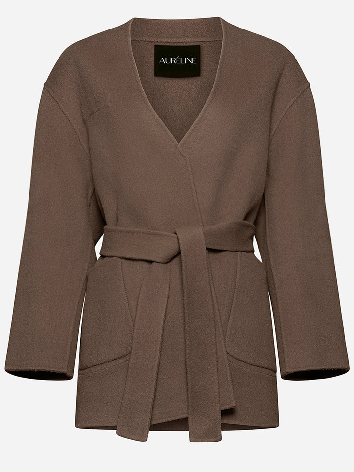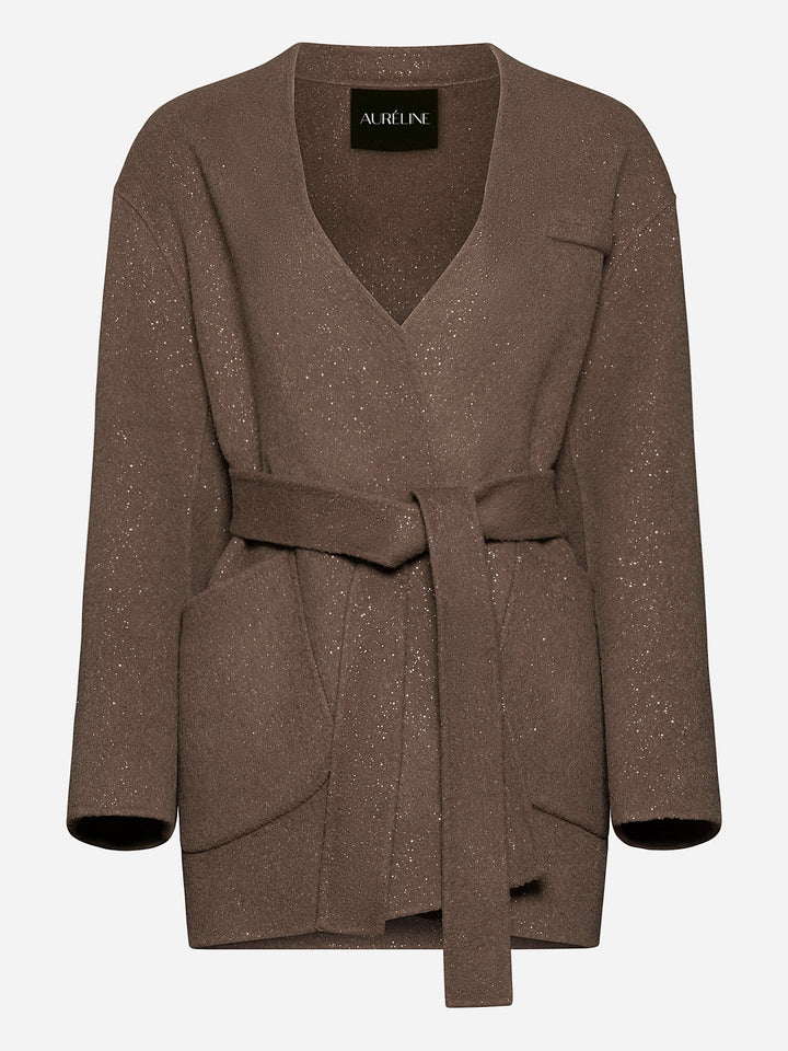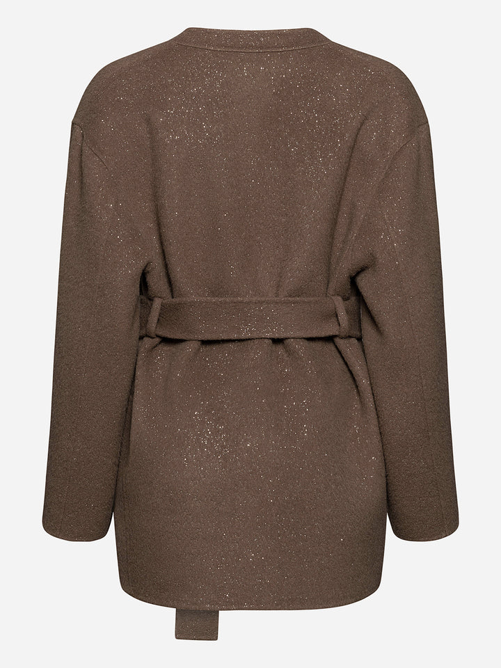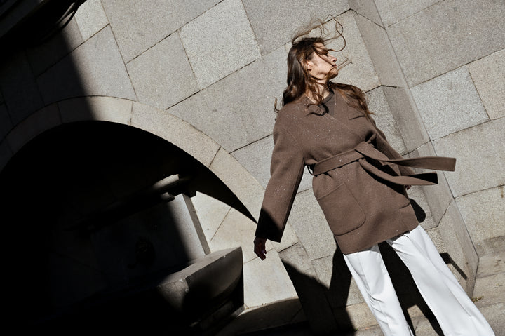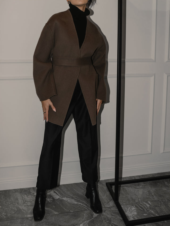 Палто "Beau" е изработено от уникална двустранна материя, предлагаща бляскав завършек от едната страна и елегантен, минималистичен вид от другата, което ви позволява лесно да сменяте стиловете на обличане. Кафяв мек нюанс. Силуетът наподобява класическо сако с колан, който подчертава талията. Носете с колана или без него за по-небрежна визия. Идеално както за официални поводи, така и за изисканото ежедневие.