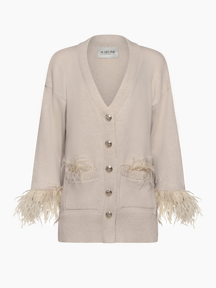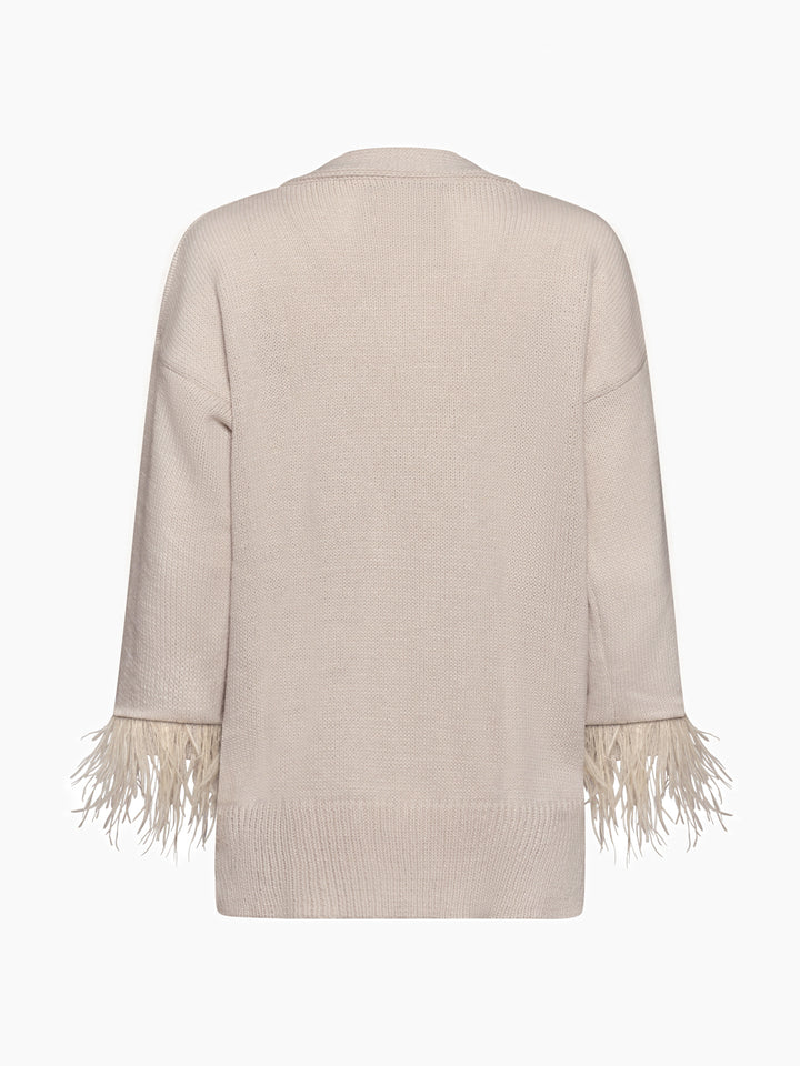Hand knitted soft and warm Merino Wool blend cardigan with Ostrich Feathers in soft pink shade beige color. Sophisticated golden buttons.