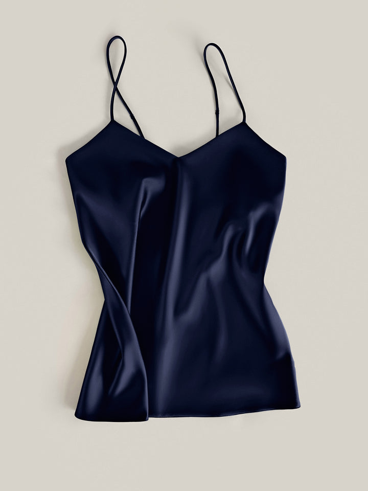 Feminine Cami Top, made of butter soft satin fabric. Elongated back and spaghetti straps with regulators in light gold. Beautiful Dark Blue color. Complete the...